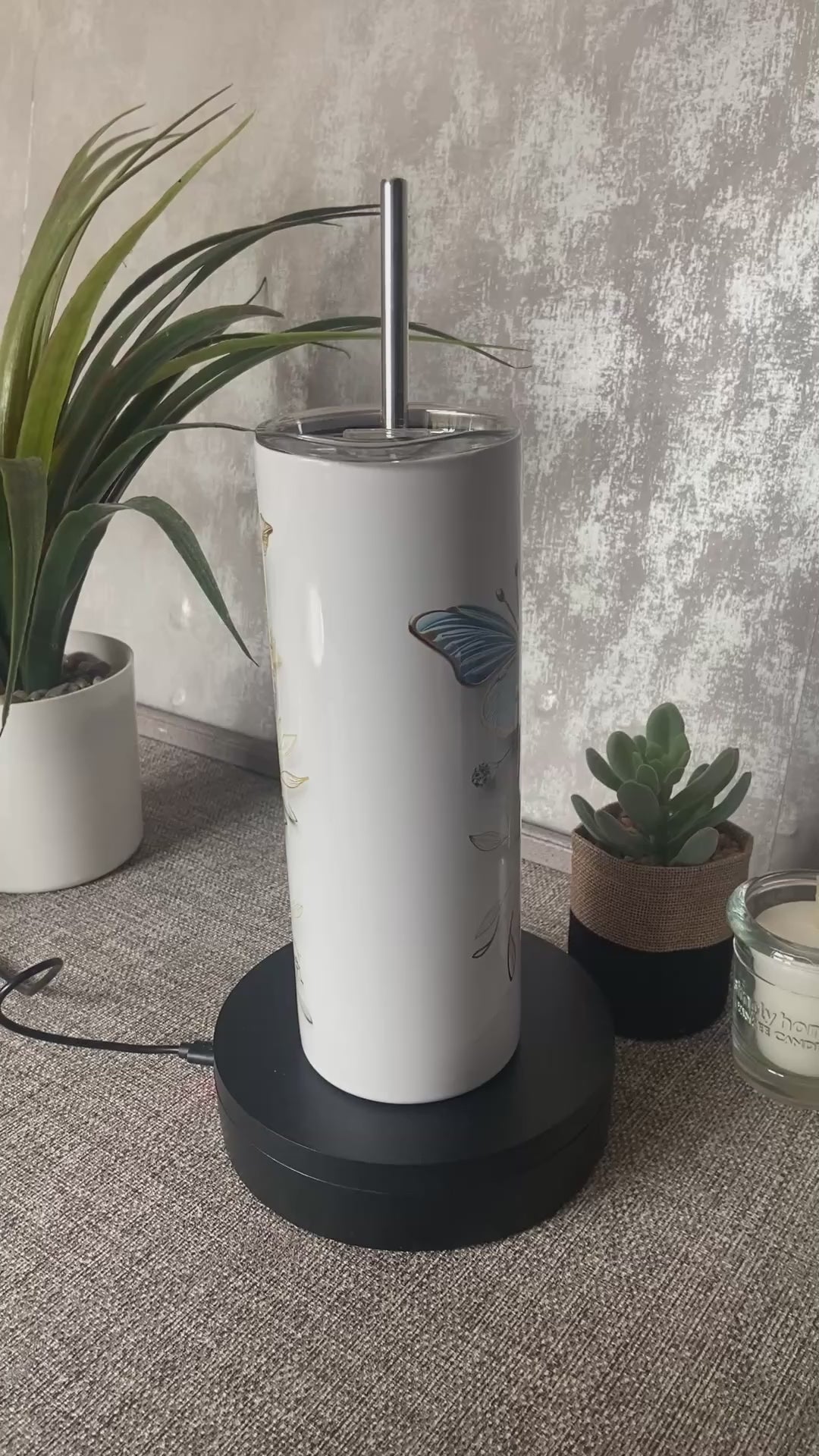 20oz Thermal Stainless Steel Tumbler & Straw, 3D Gold, Blue White Floral Butterflies