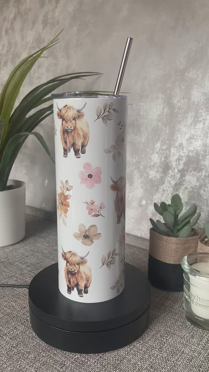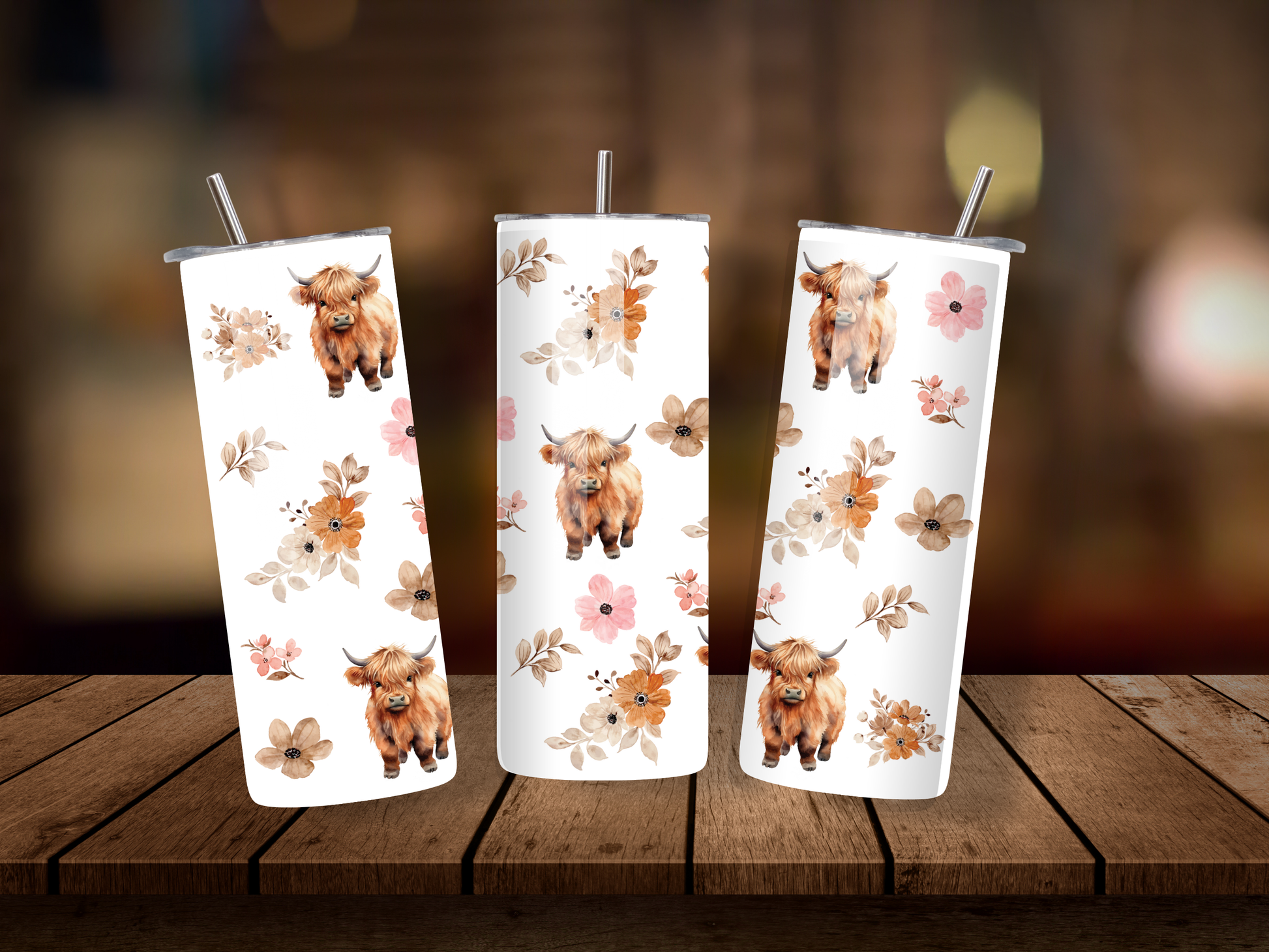 20oz Thermal Stainless Steel Tumbler & Straw, Highland Cow Pattern