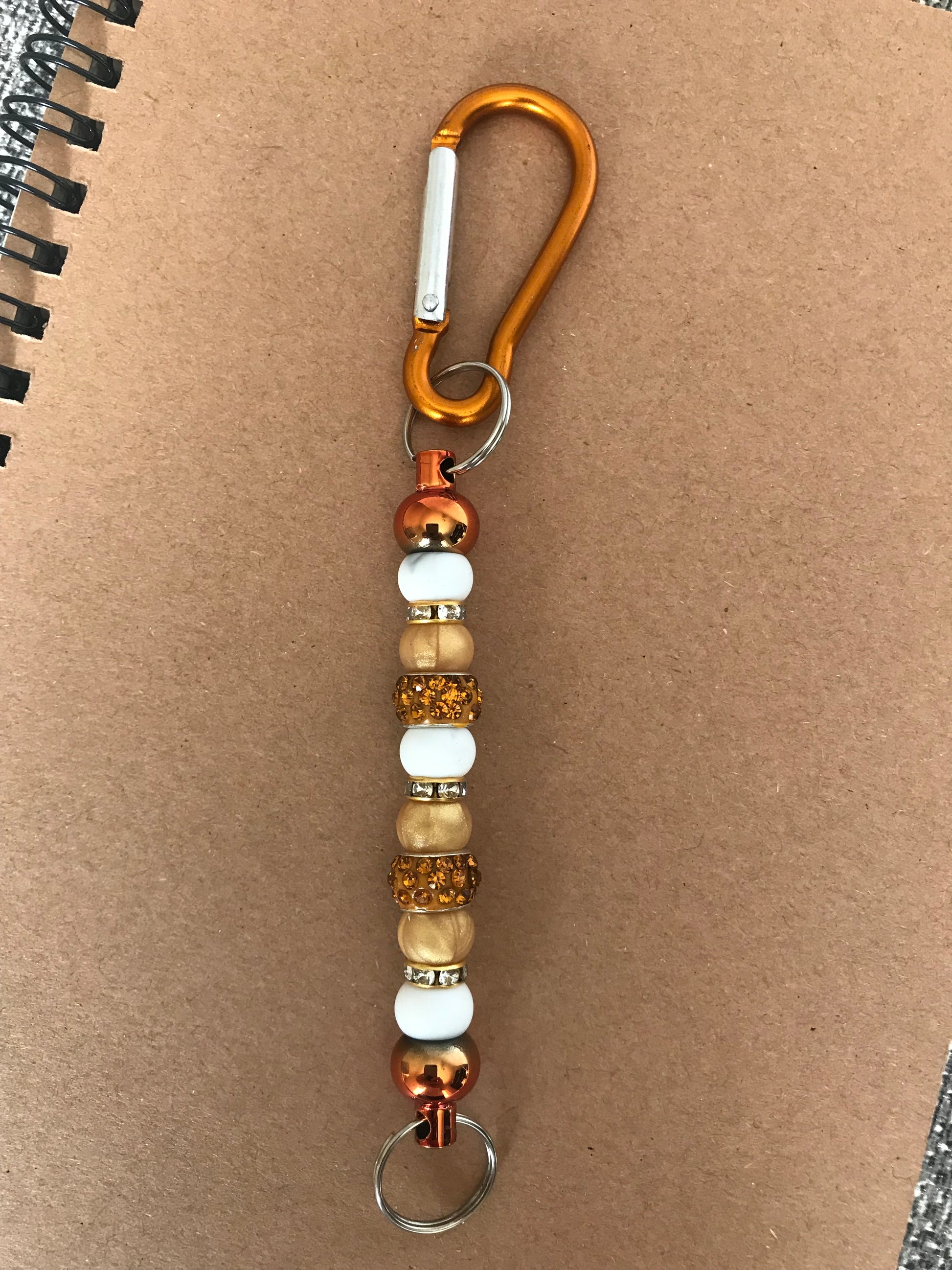 Bronze Carabiner Clip Keychain with Gold, White & Rhinestone Beads