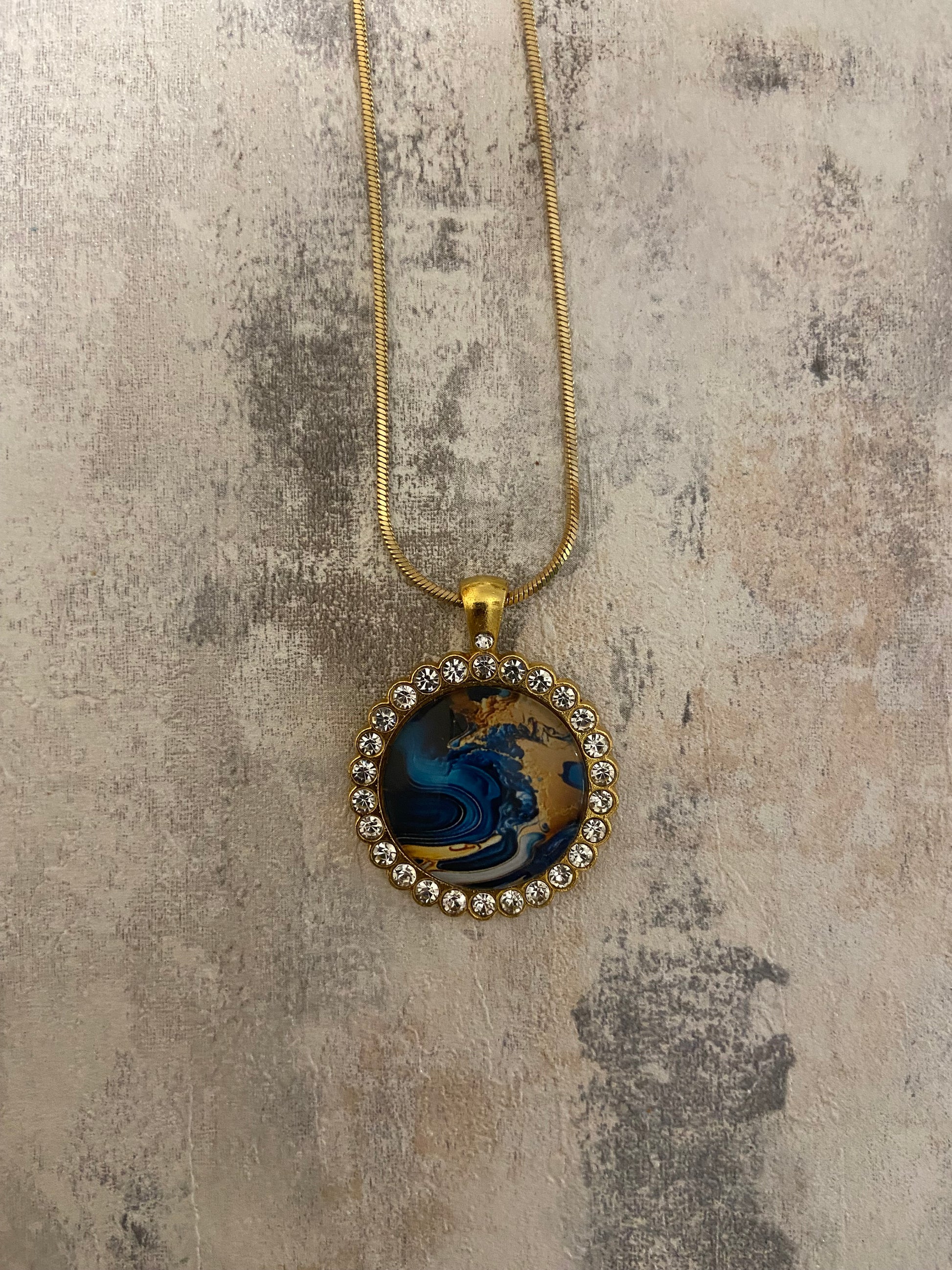 Dazzling & beautiful large blue/gold liquid art pendant 3x3cm Pendant (60cm chain)