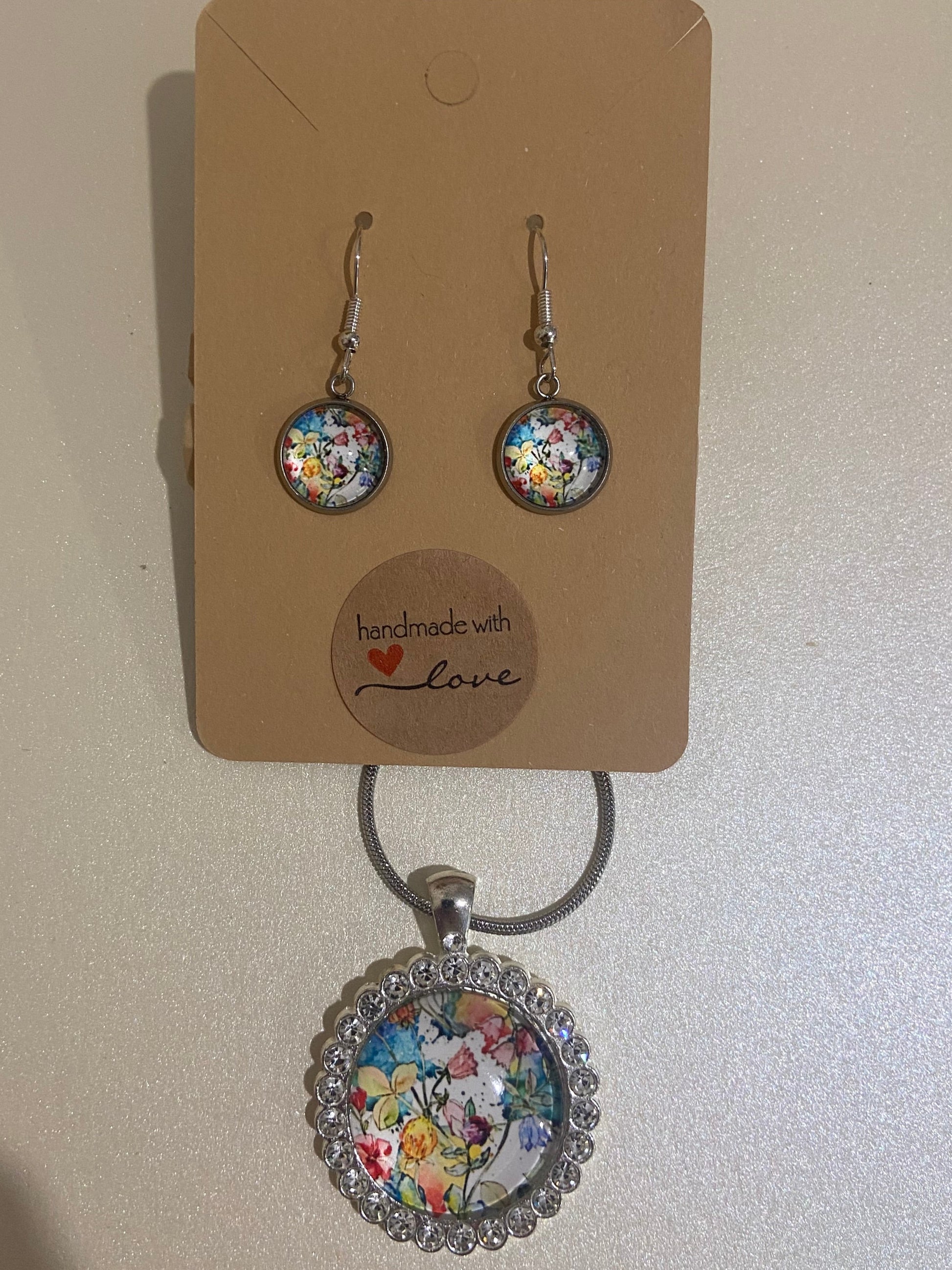Materials: Pendant Centres - Glass - Rhinestone Bezel Pendant Case - Zinc Alloy Earring hardware & Necklace chain - Stainless Steel