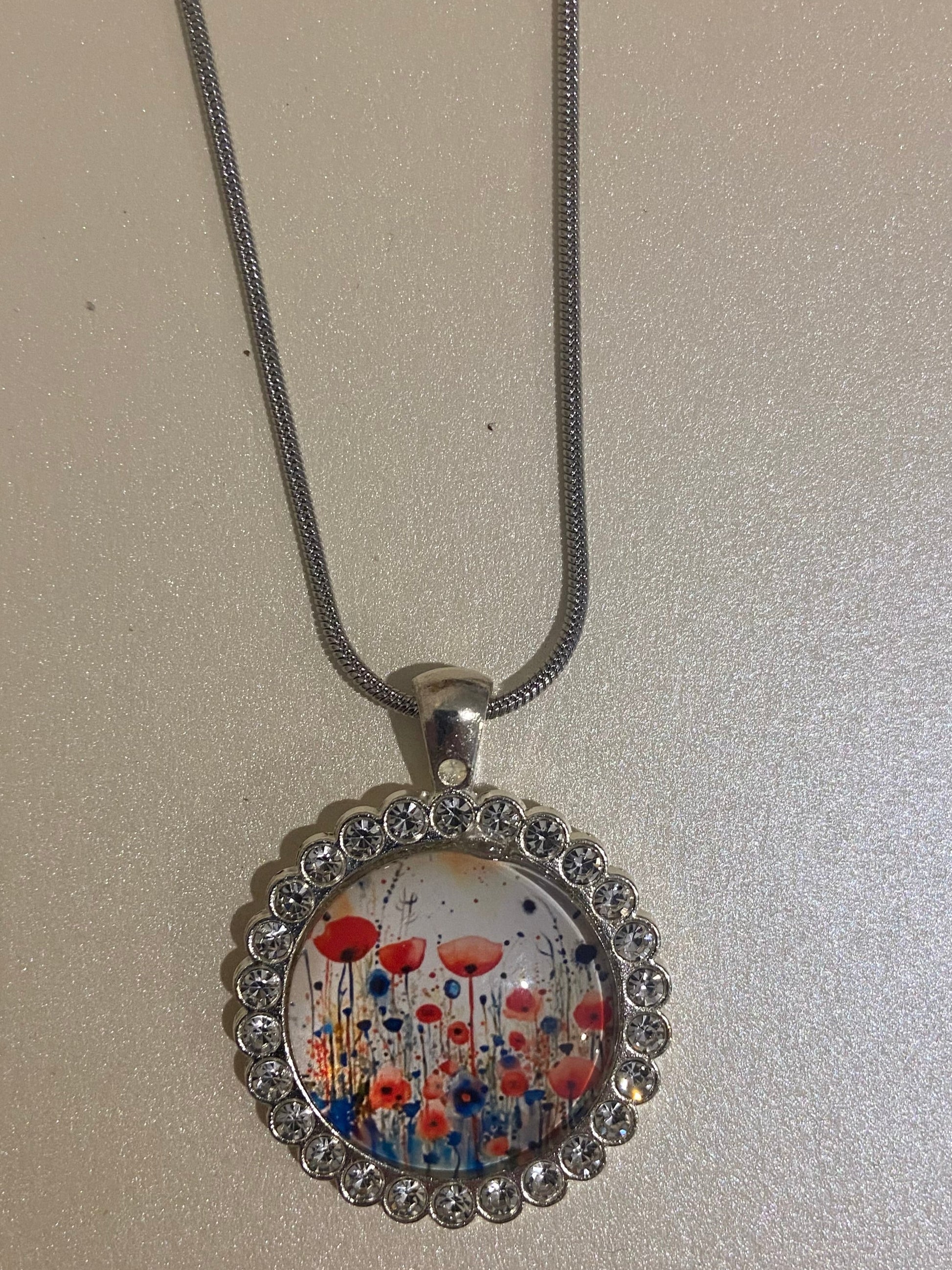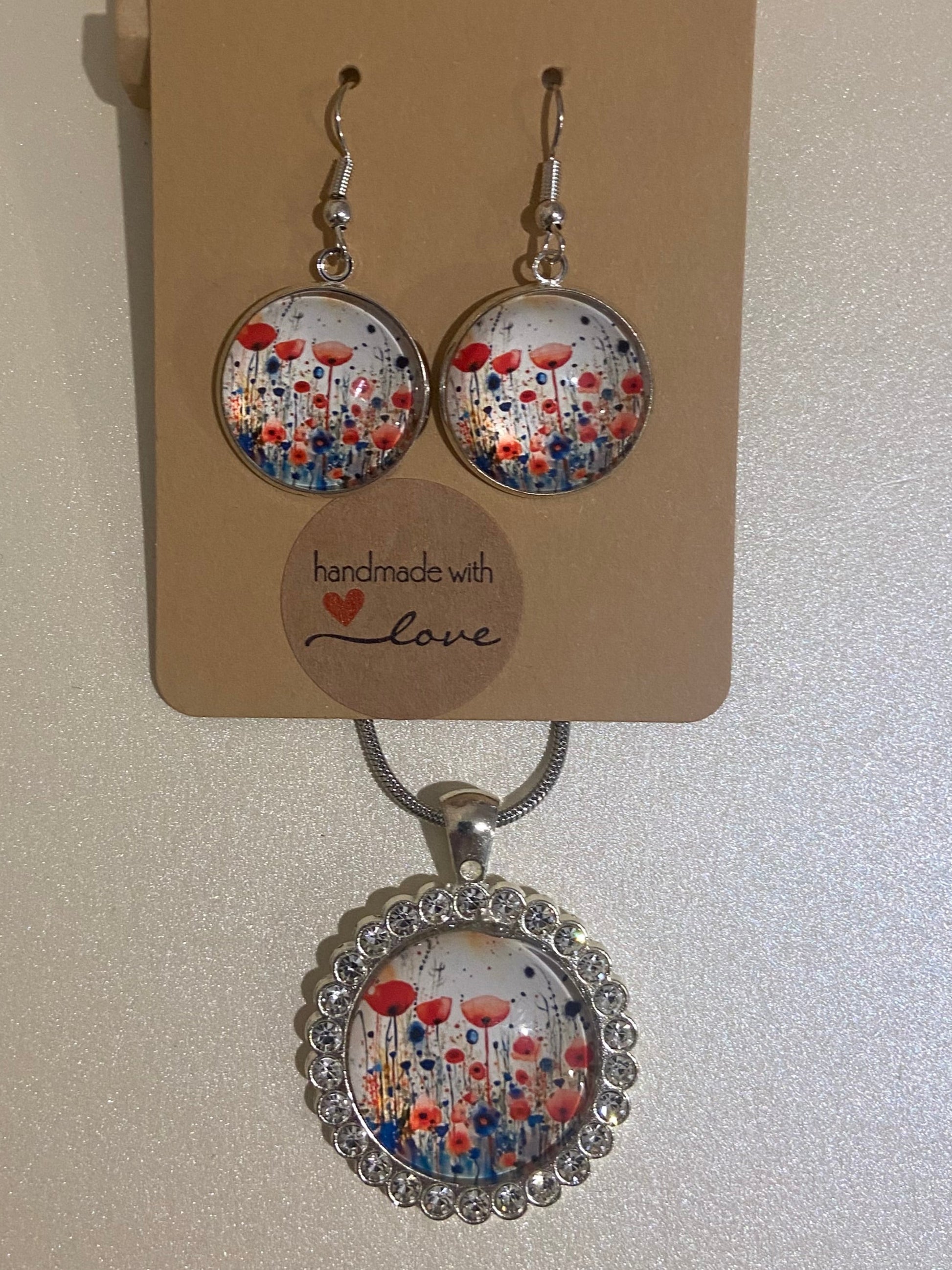 Materials: Pendant Centres - Glass - Rhinestone Bezel Pendant Case - Zinc Alloy Earring hardware & Necklace chain - Stainless Steel