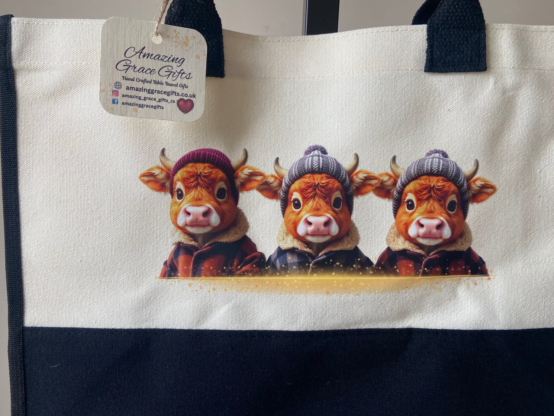 Large Canvas Tote Bag Contrast Black/ Cream Highland Cows