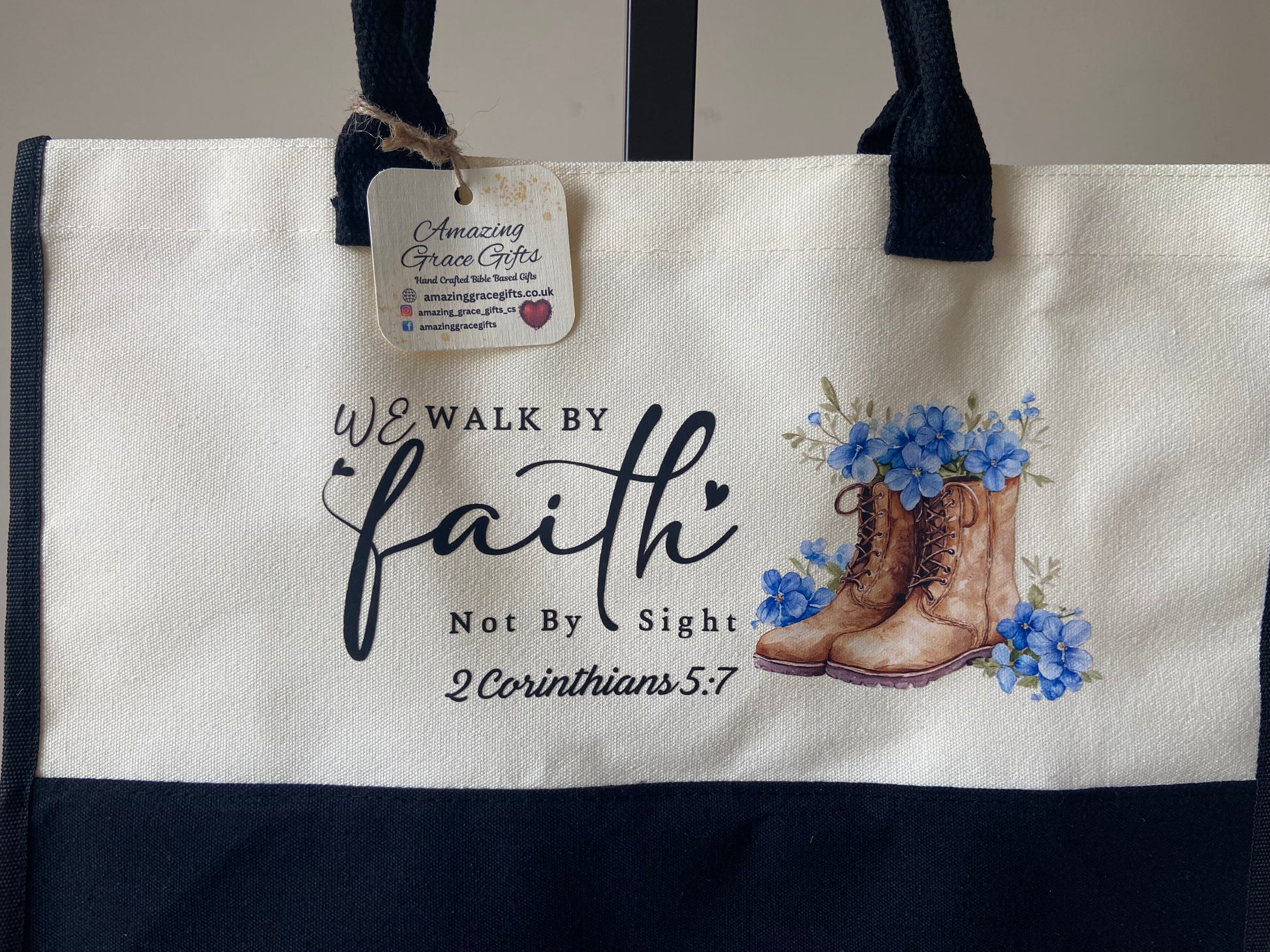Large Canvas Tote Bag Contrast Black/ Cream We Walk By Faith 2 Corinthians 5:7