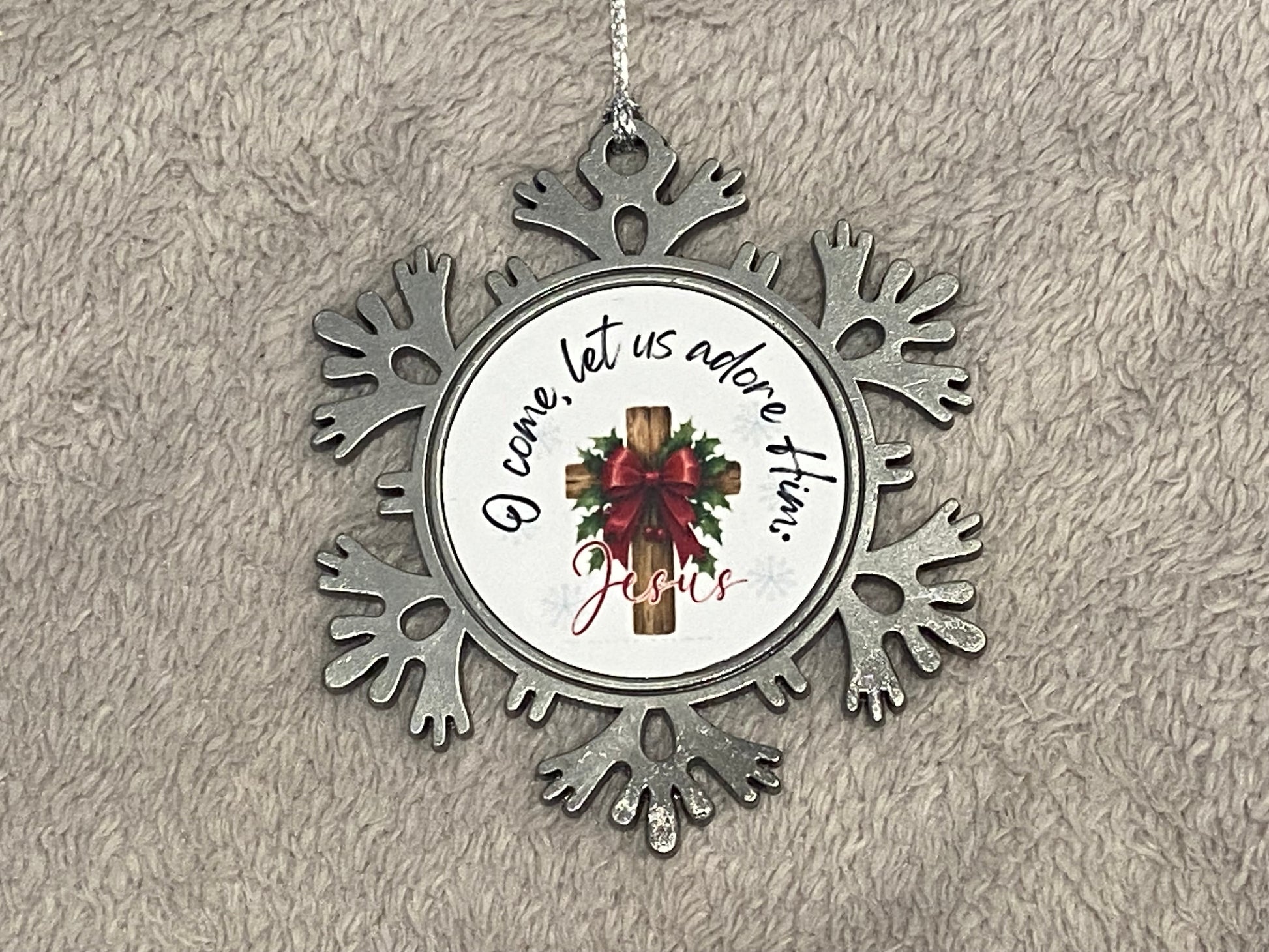 Metal Star Silver Hanging CHRISTmas decoration - O Come Let Us Adore Him - Jesus