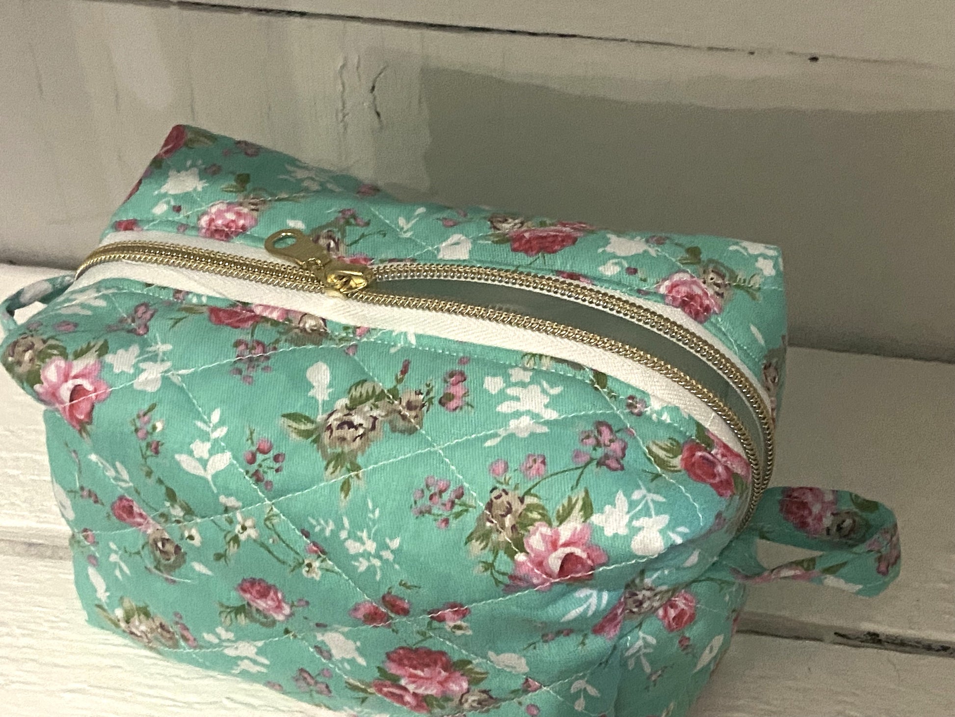 Quilted Boxy Pouch - Medium - Rose with Turquoise background