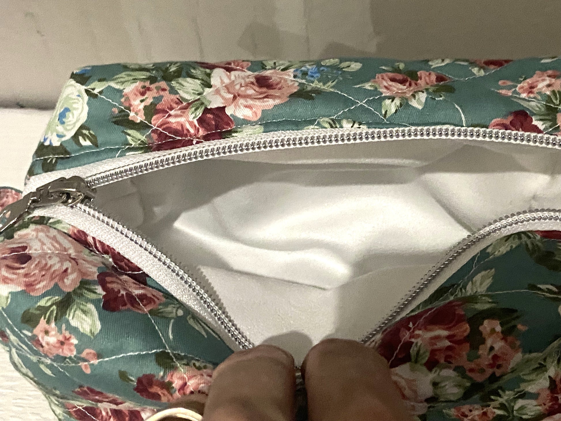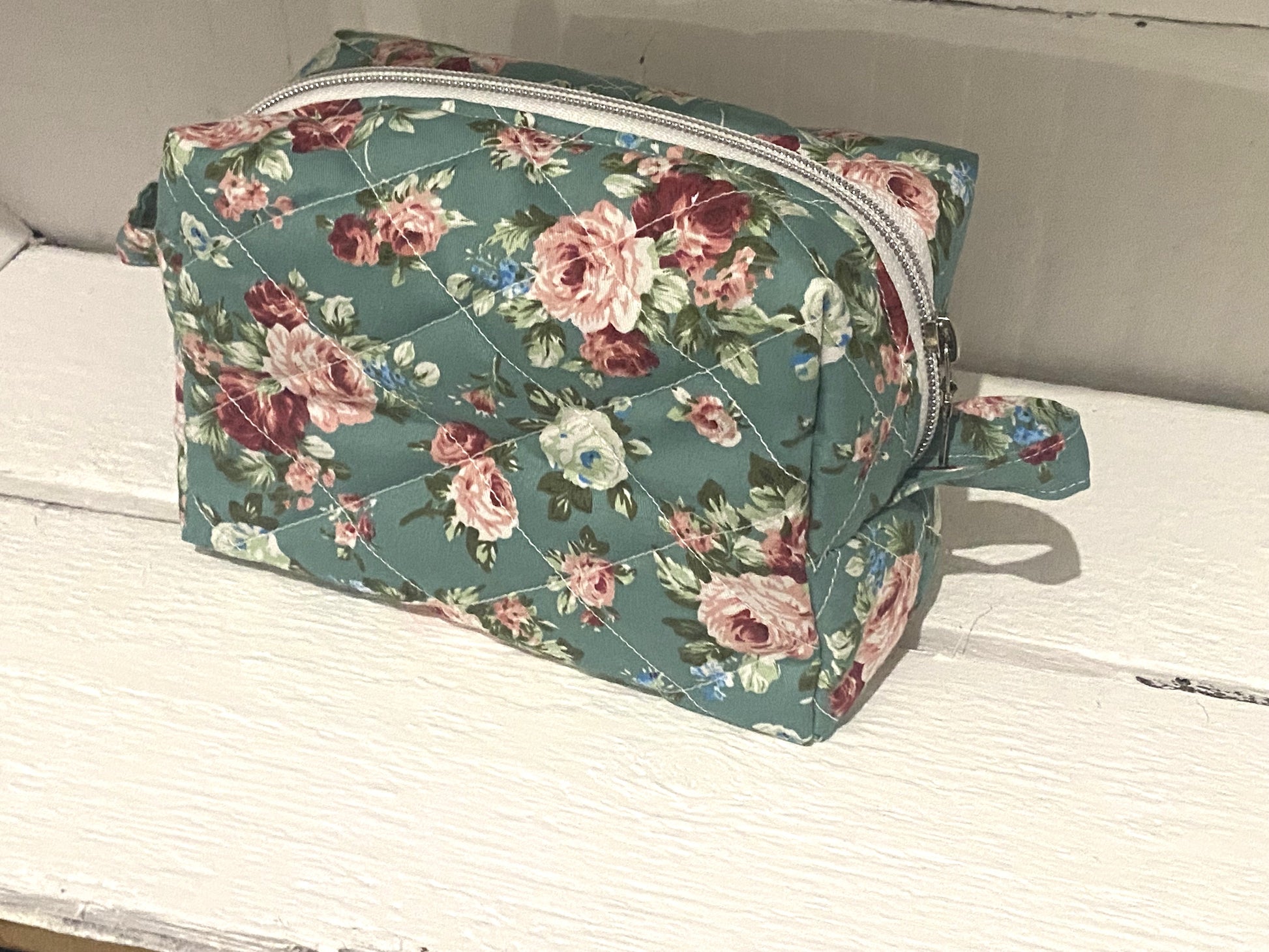 Quilted Boxy Pouch - Medium - Roses with Deep Teal background