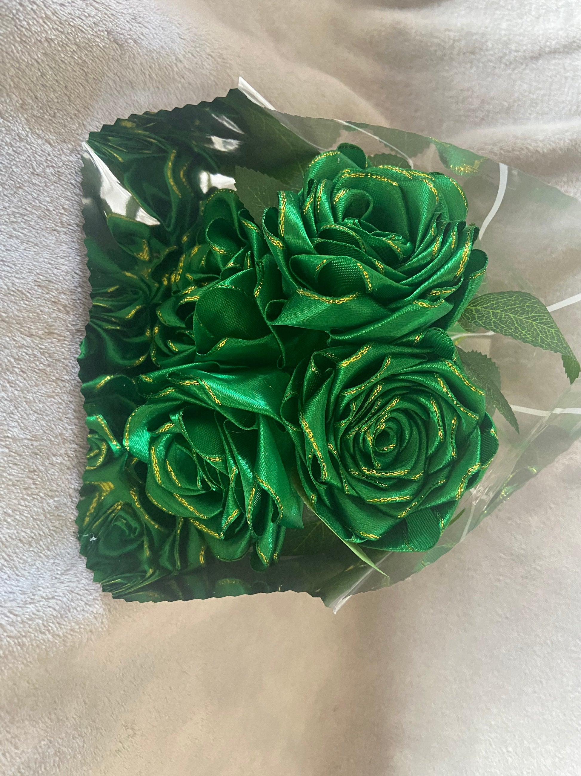 Roses made from beautiful double sided satin ribbon with gold edging.