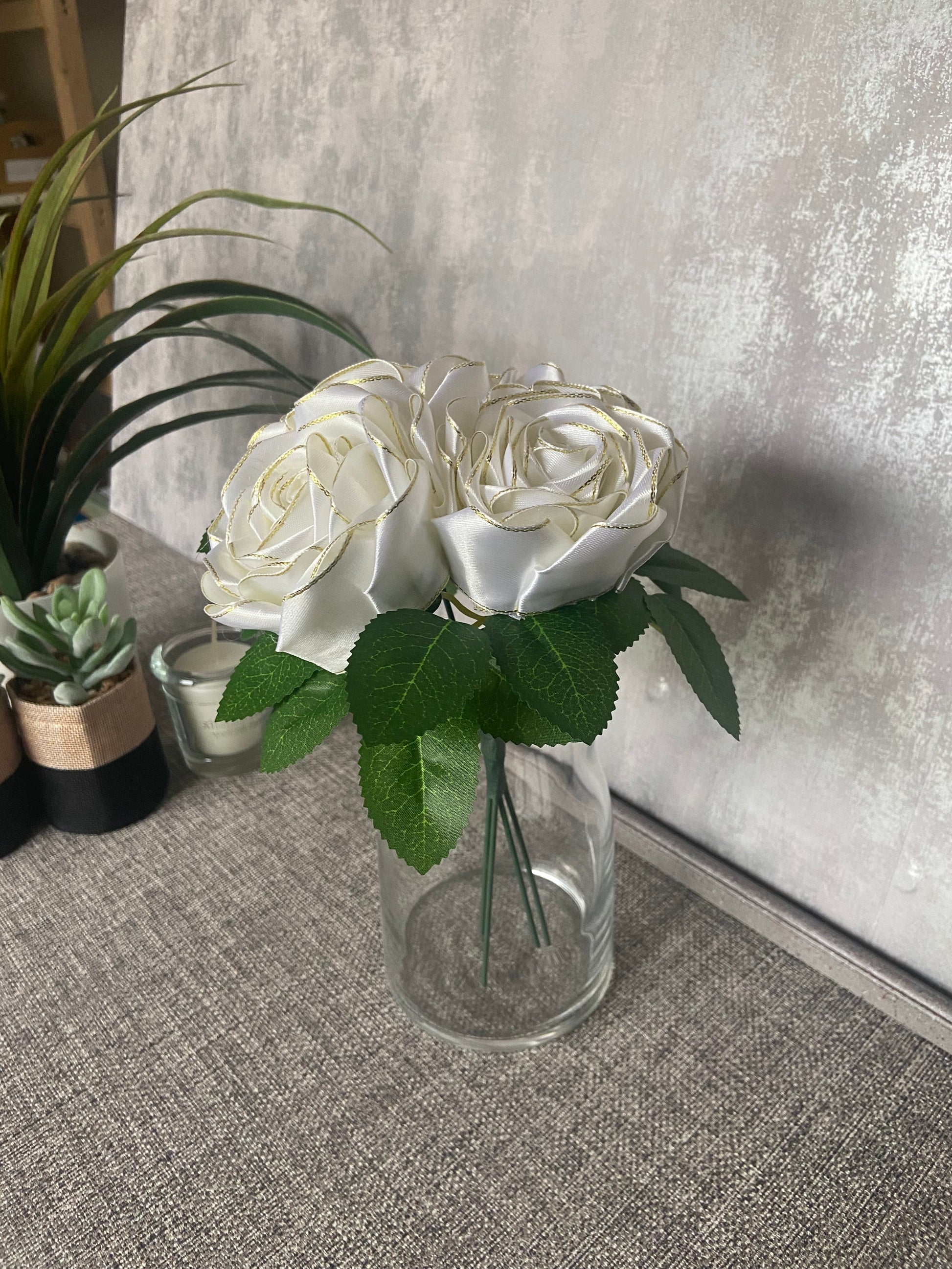 Roses made from beautiful double sided satin ribbon with gold edging.