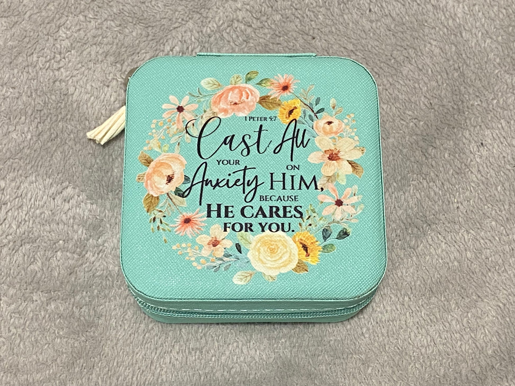 Cyan Travel Jewellery Box - Cast All Your Anxiety On Him Because He Cares For You 1 Peter 5:7